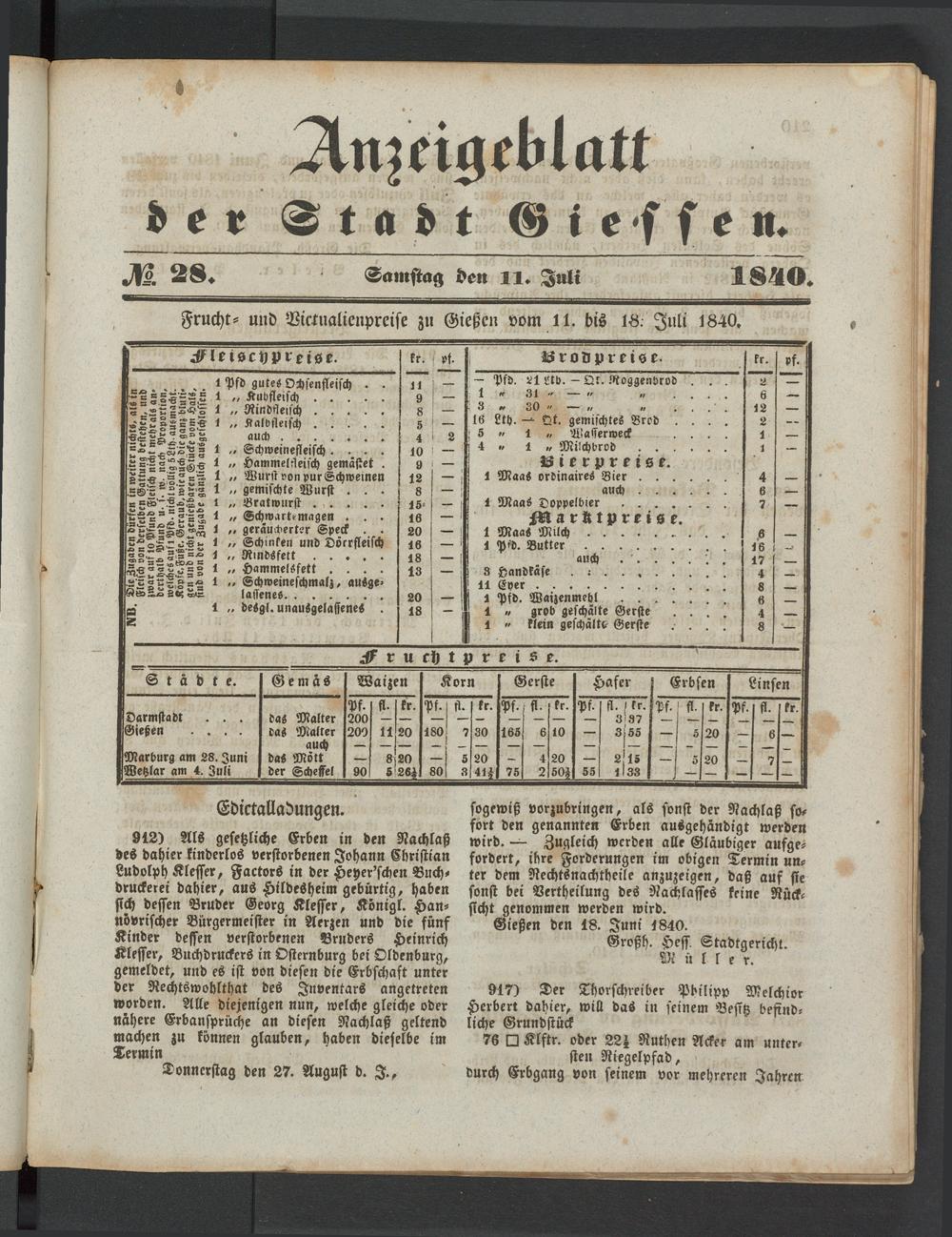 Anzeigeblatt für die Provinzialhauptstadt Gießen. 1840-1867