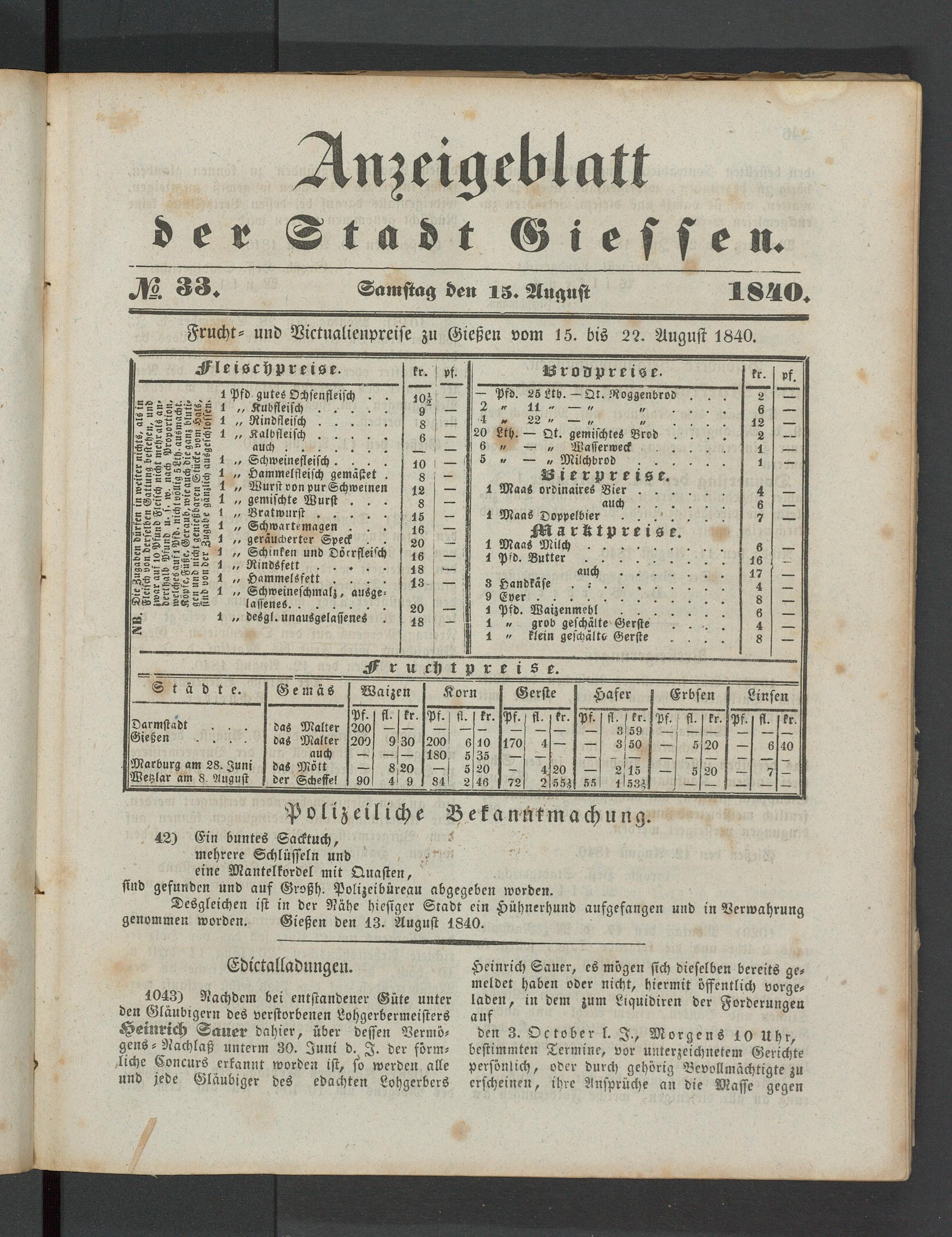 Anzeigeblatt für die Provinzialhauptstadt Gießen. 1840-1867