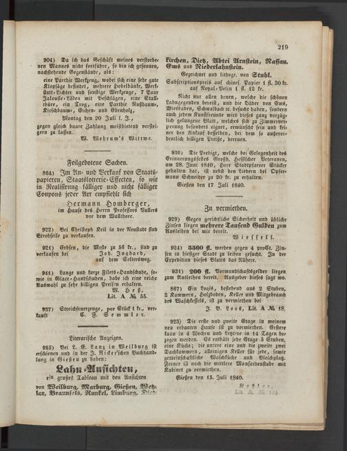 Anzeigeblatt für die Provinzialhauptstadt Gießen. 1840-1867