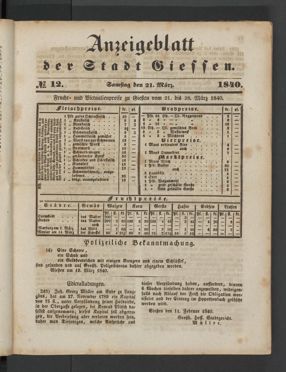Anzeigeblatt für die Provinzialhauptstadt Gießen. 1840-1867