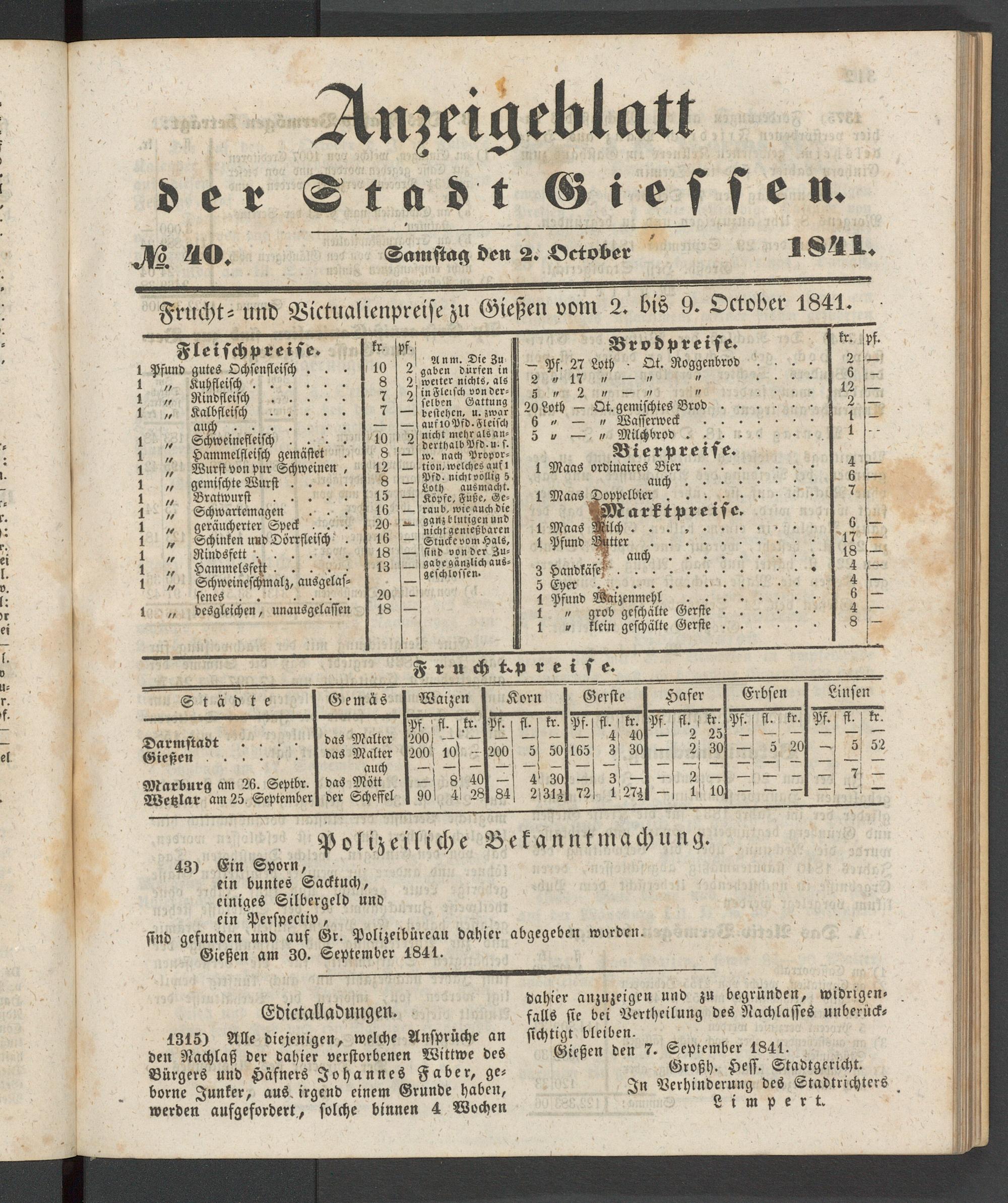 Anzeigeblatt für die Provinzialhauptstadt Gießen. 1840-1867