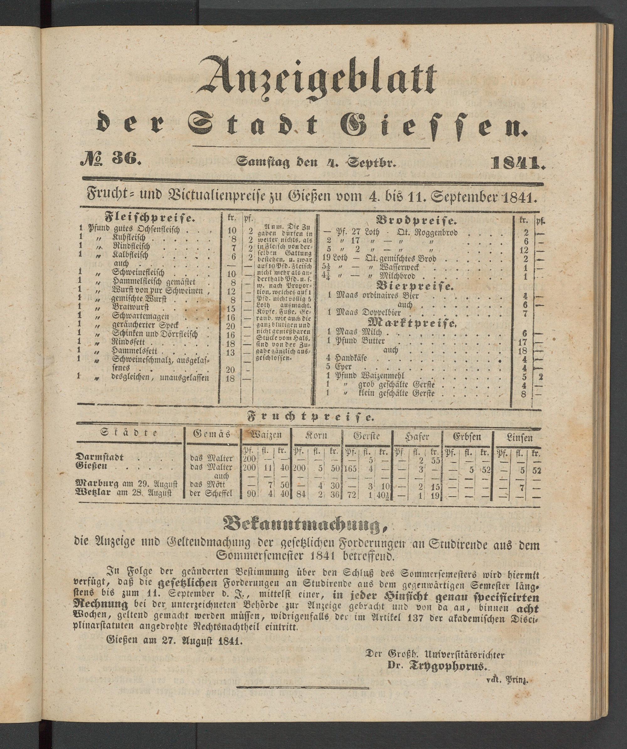Anzeigeblatt für die Provinzialhauptstadt Gießen. 1840-1867