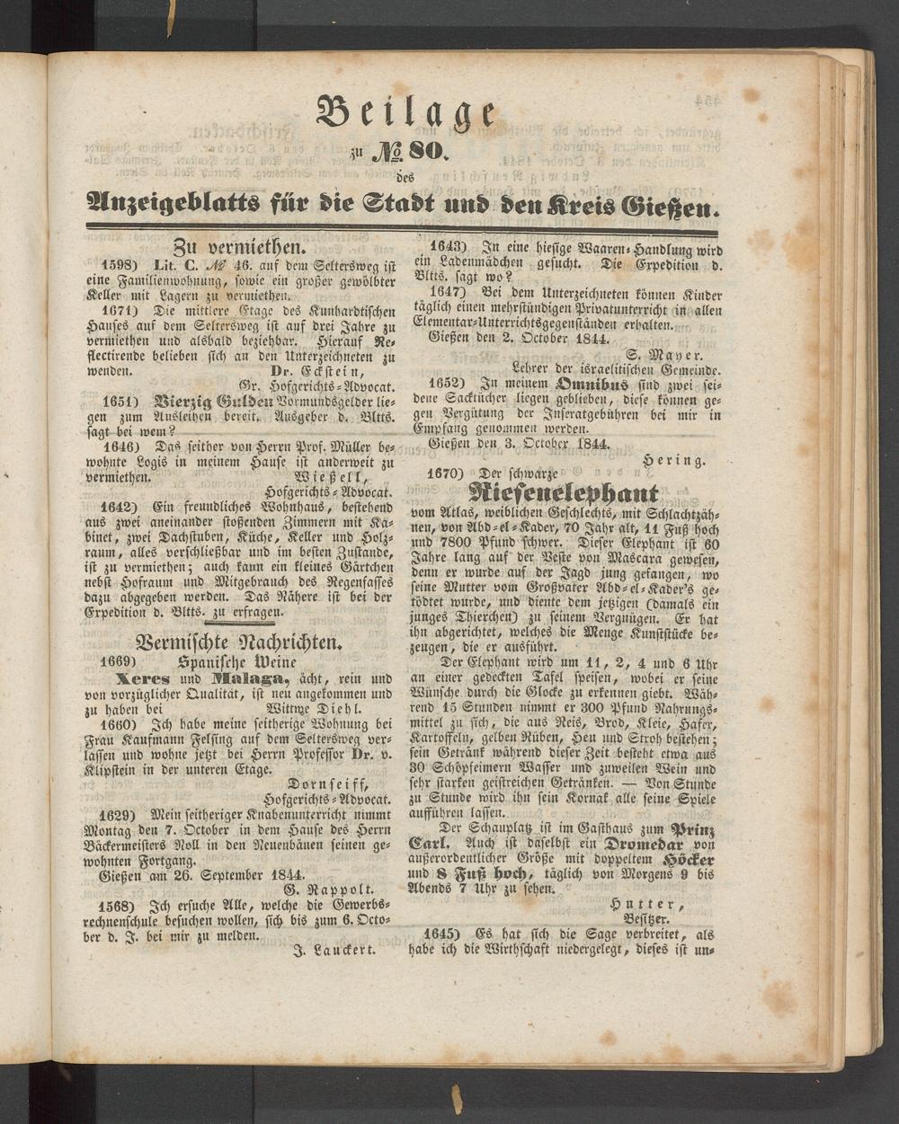 Anzeigeblatt für die Provinzialhauptstadt Gießen. 1840-1867