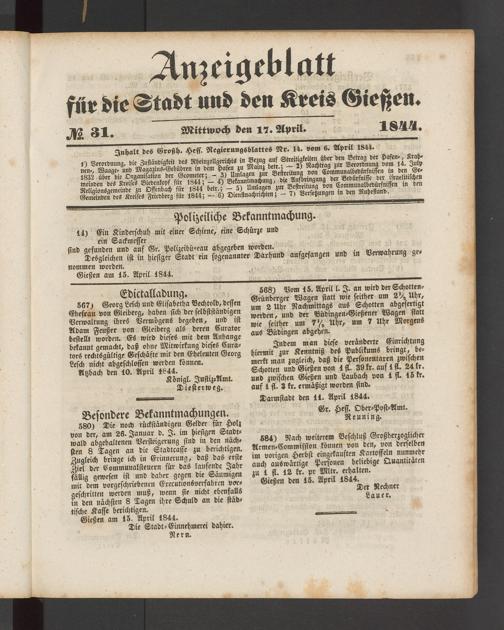 Anzeigeblatt für die Provinzialhauptstadt Gießen. 1840-1867