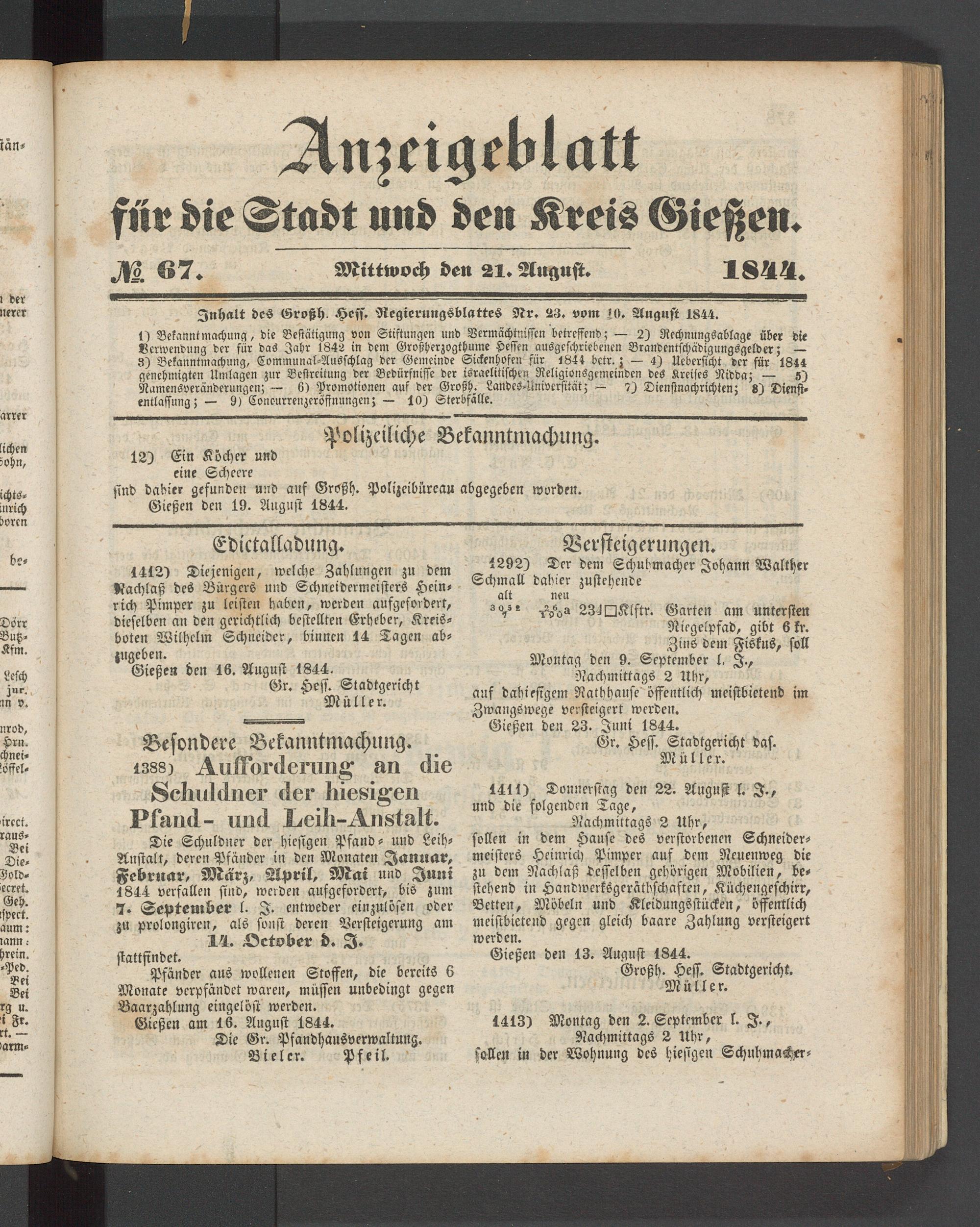 Anzeigeblatt für die Provinzialhauptstadt Gießen. 1840-1867