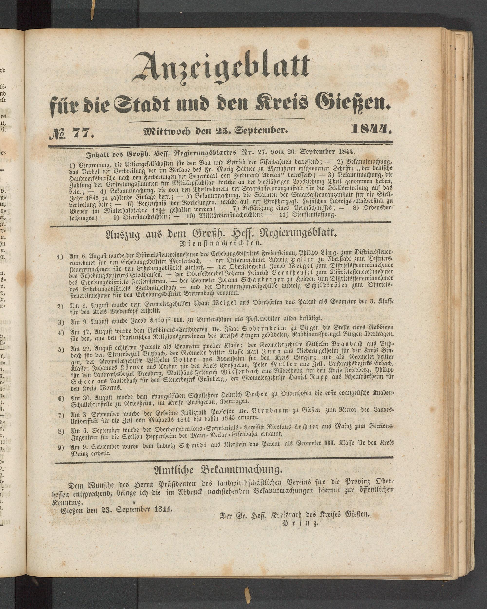 Anzeigeblatt für die Provinzialhauptstadt Gießen. 1840-1867