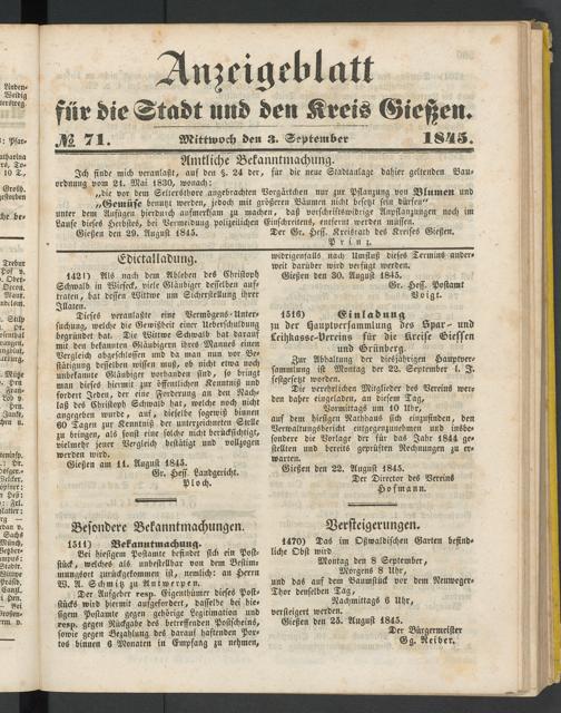 Anzeigeblatt für die Provinzialhauptstadt Gießen. 1840-1867