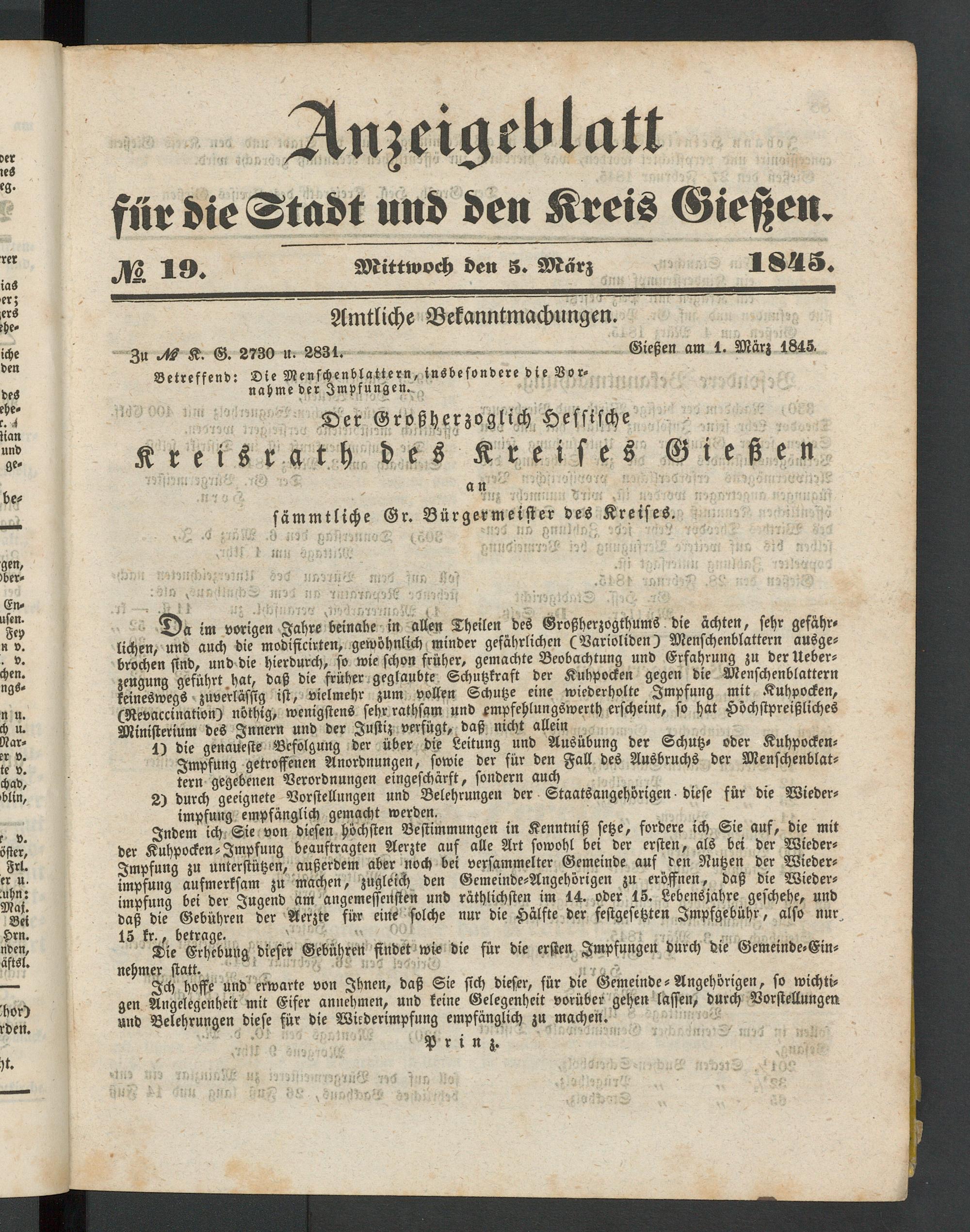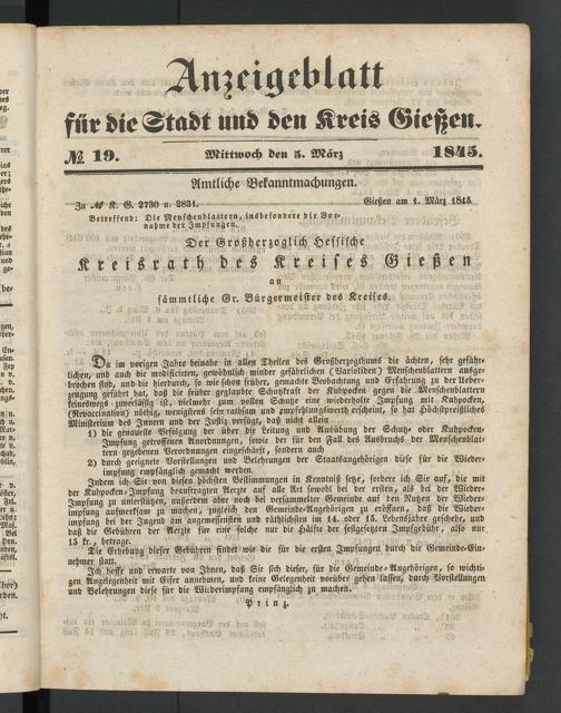 Anzeigeblatt für die Provinzialhauptstadt Gießen. 1840-1867