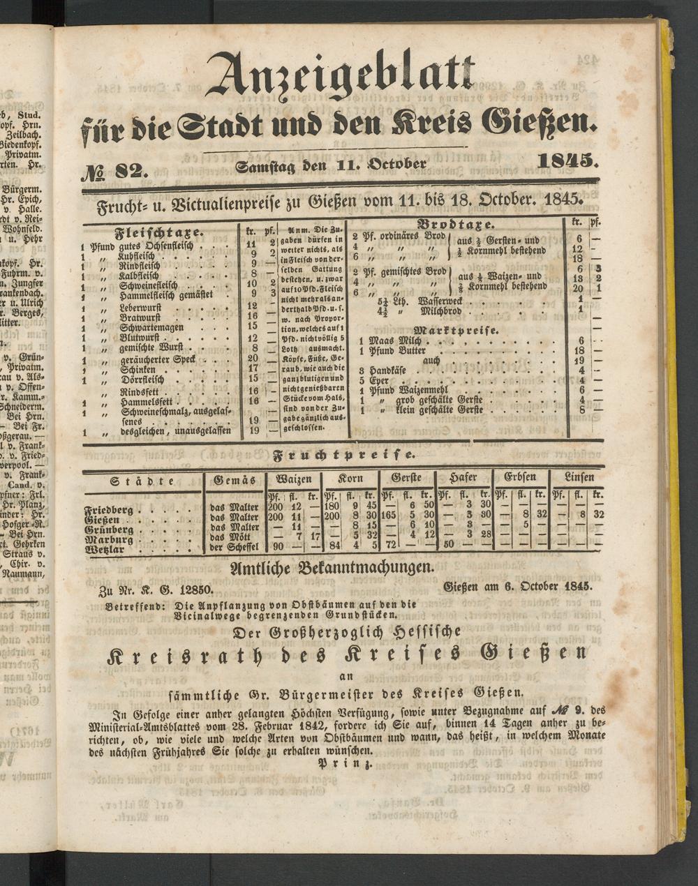 Anzeigeblatt für die Provinzialhauptstadt Gießen. 1840-1867