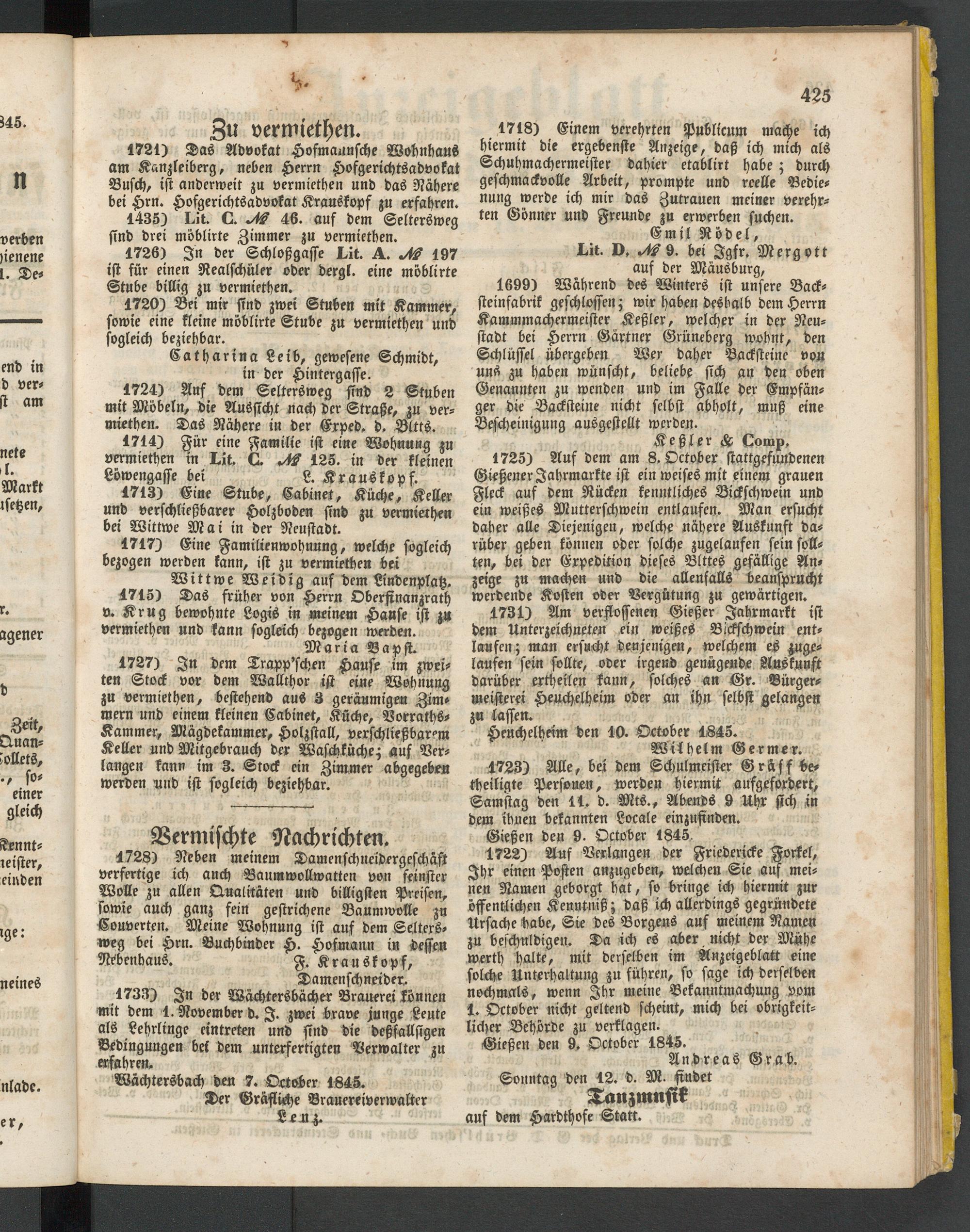 Anzeigeblatt für die Provinzialhauptstadt Gießen. 1840-1867