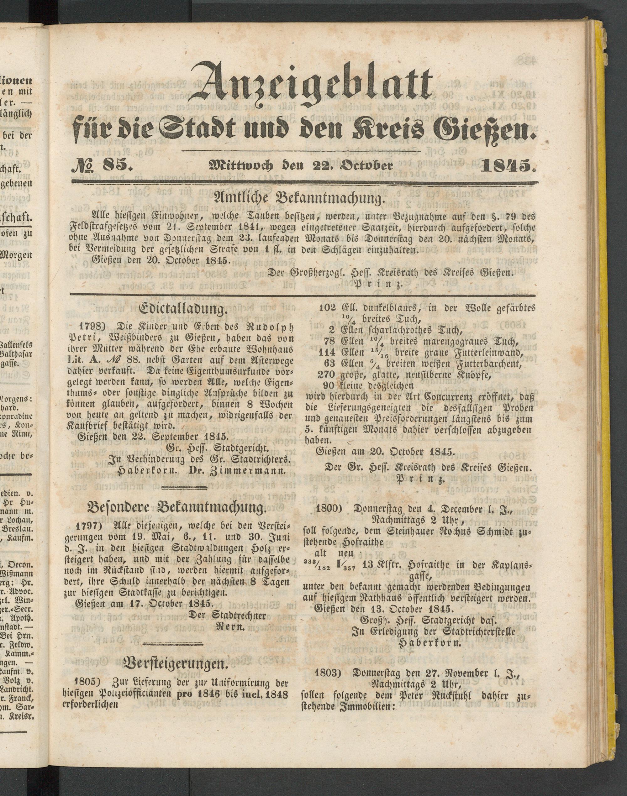 Anzeigeblatt für die Provinzialhauptstadt Gießen. 1840-1867