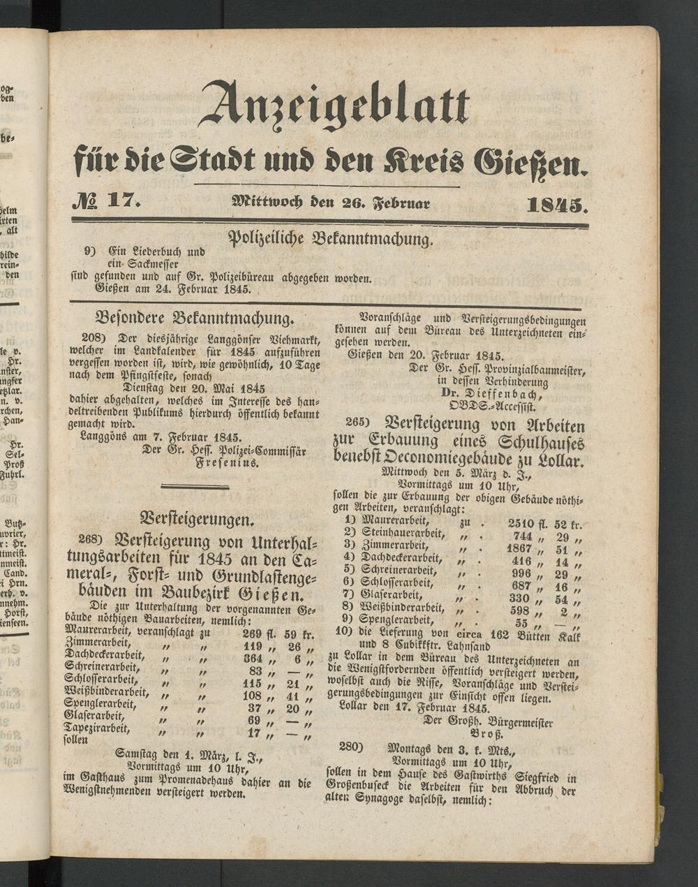 Anzeigeblatt für die Provinzialhauptstadt Gießen. 1840-1867