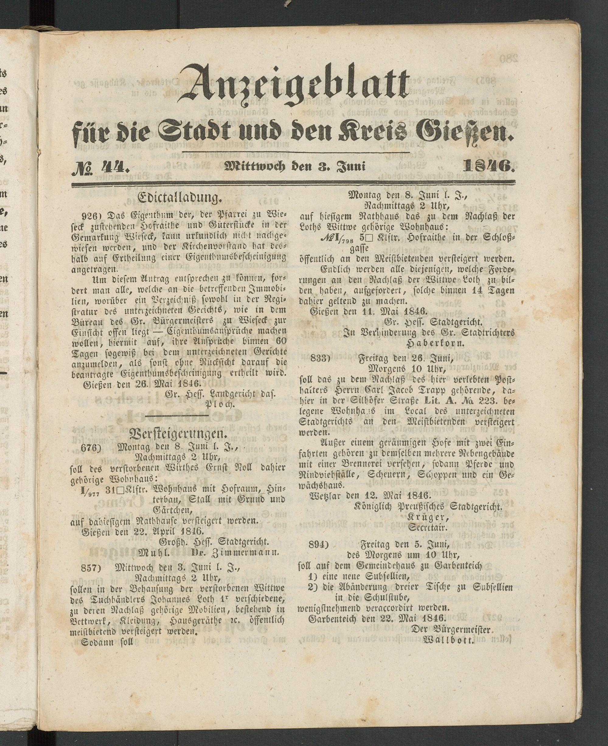 Anzeigeblatt für die Provinzialhauptstadt Gießen. 1840-1867