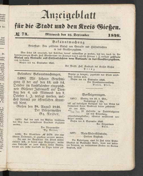 Anzeigeblatt für die Provinzialhauptstadt Gießen. 1840-1867