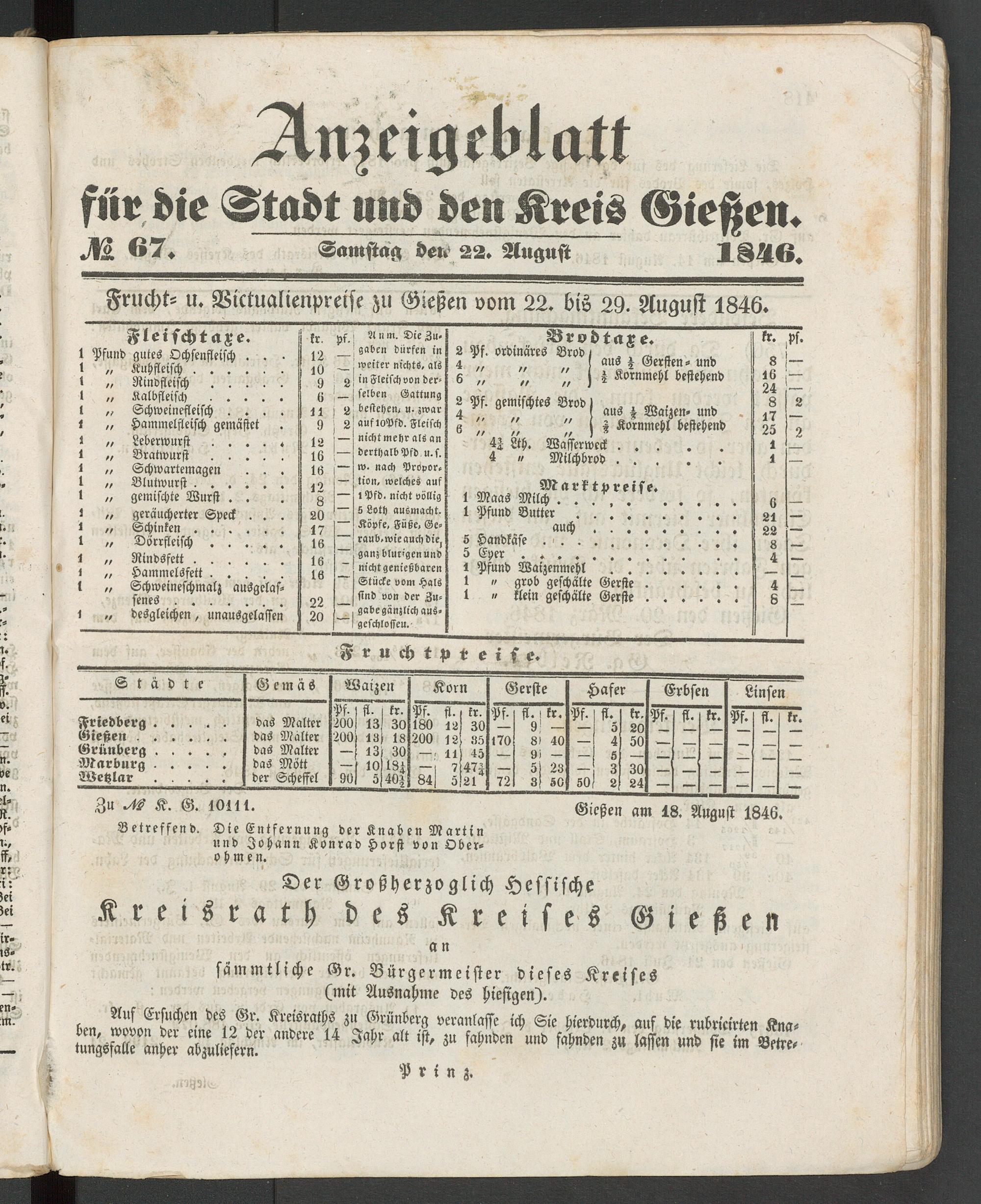 Anzeigeblatt für die Provinzialhauptstadt Gießen. 1840-1867