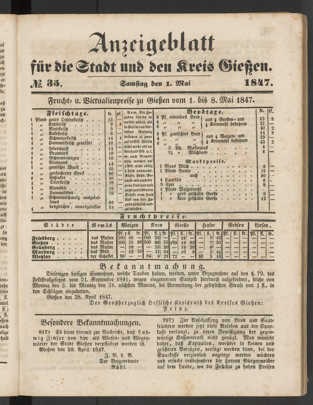 Anzeigeblatt für die Provinzialhauptstadt Gießen. 1840-1867