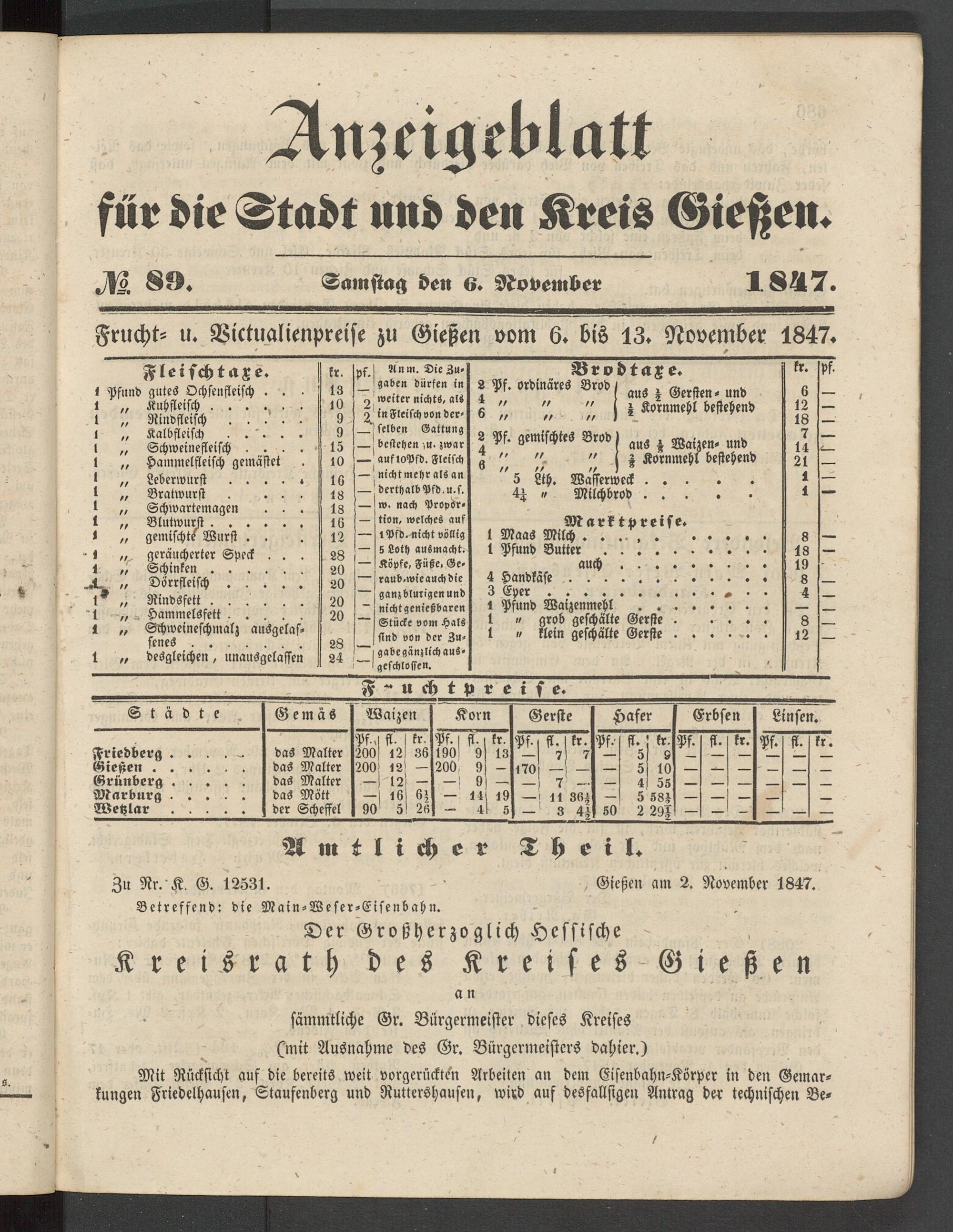 Anzeigeblatt für die Provinzialhauptstadt Gießen. 1840-1867