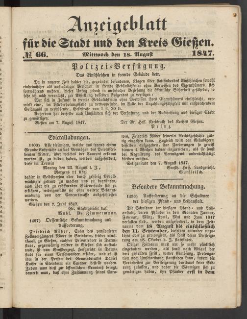 Anzeigeblatt für die Provinzialhauptstadt Gießen. 1840-1867