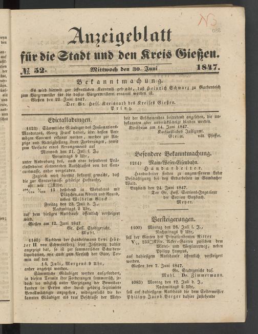 Anzeigeblatt für die Provinzialhauptstadt Gießen. 1840-1867