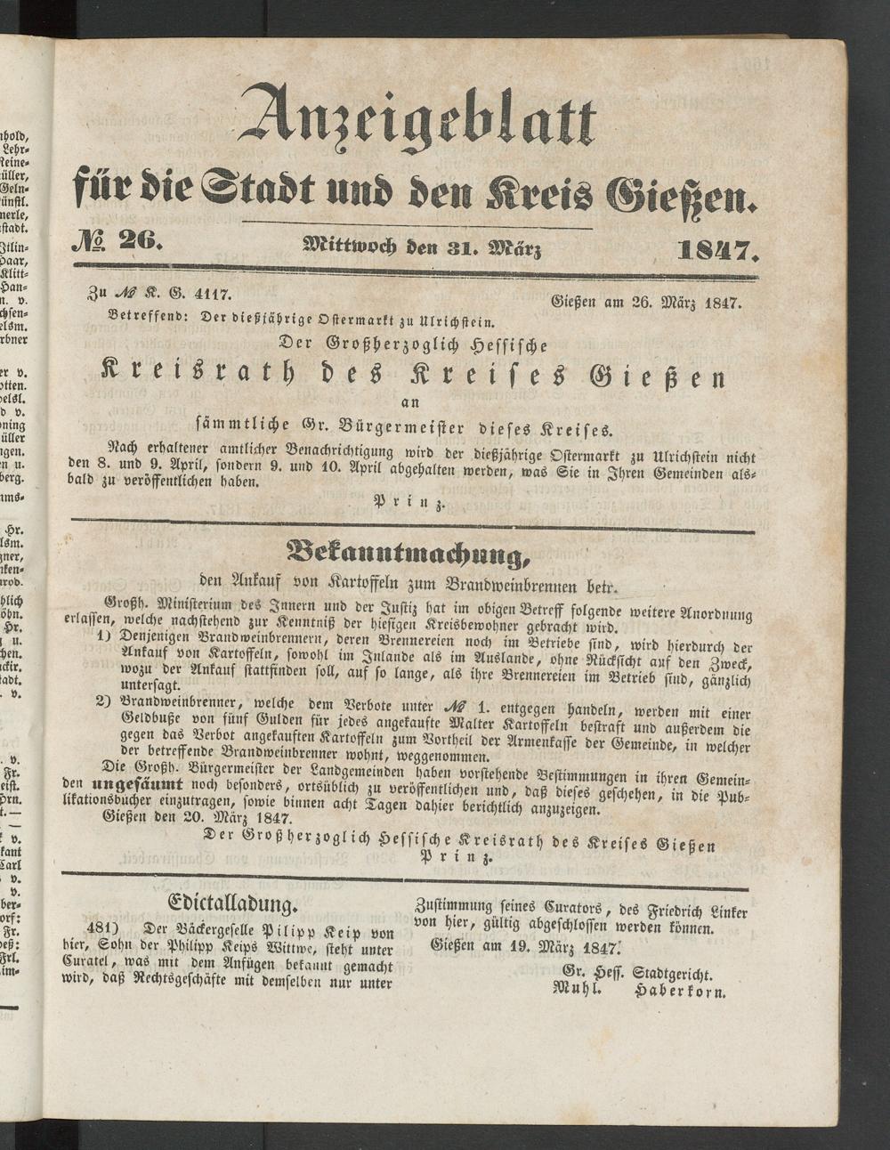 Anzeigeblatt für die Provinzialhauptstadt Gießen. 1840-1867