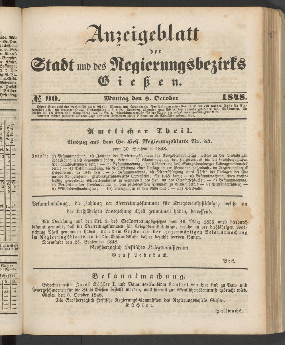 Anzeigeblatt für die Provinzialhauptstadt Gießen. 1840-1867