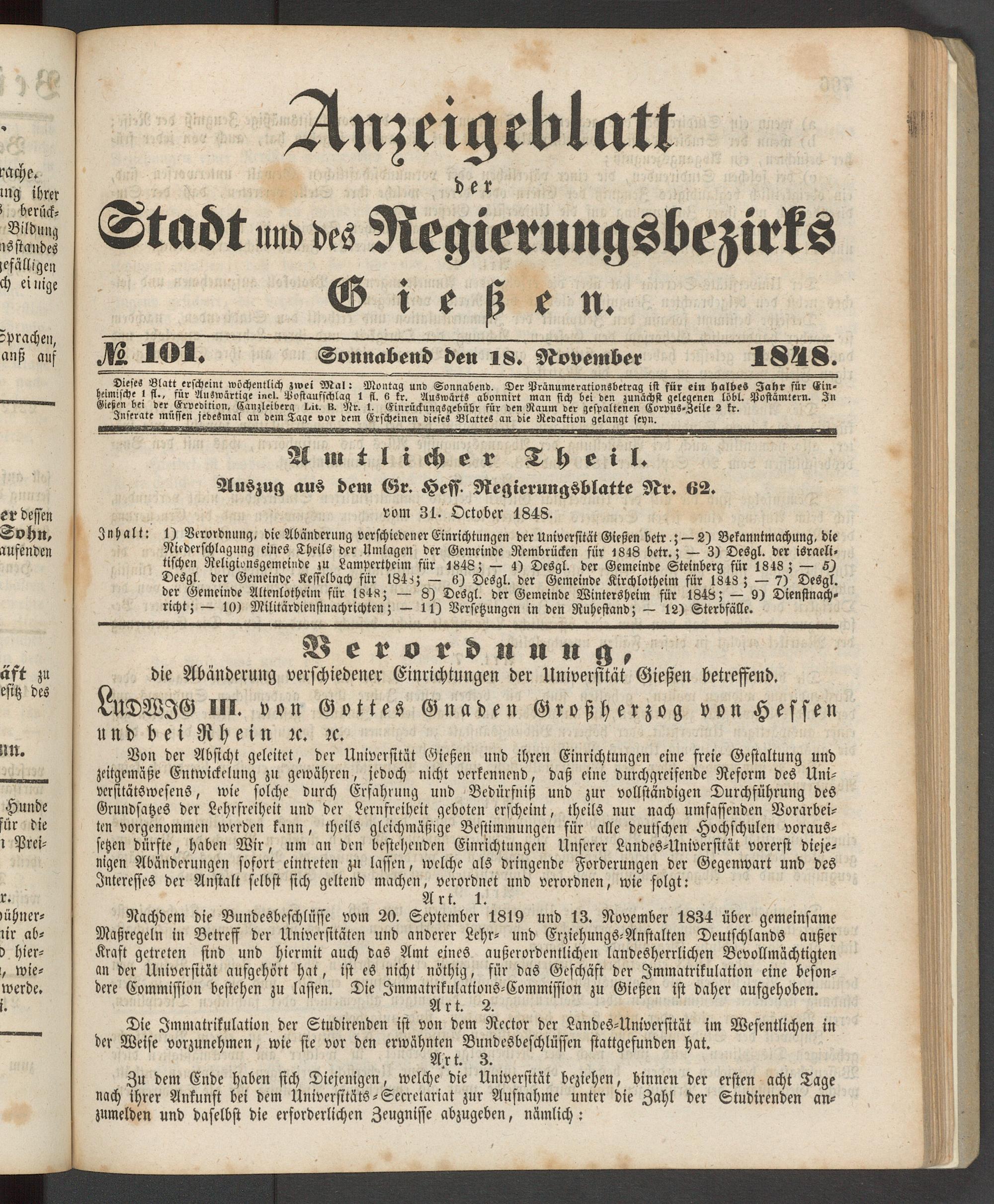 Anzeigeblatt für die Provinzialhauptstadt Gießen. 1840-1867