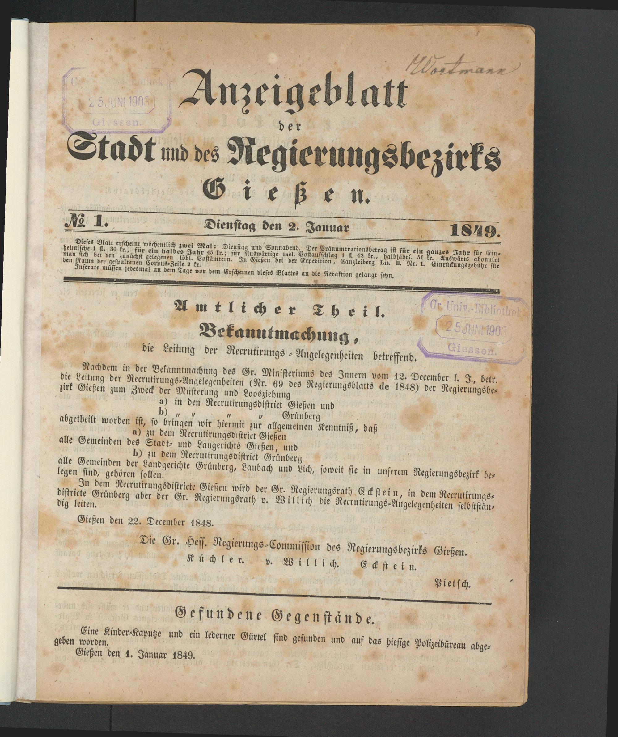 Anzeigeblatt für die Provinzialhauptstadt Gießen. 1840-1867