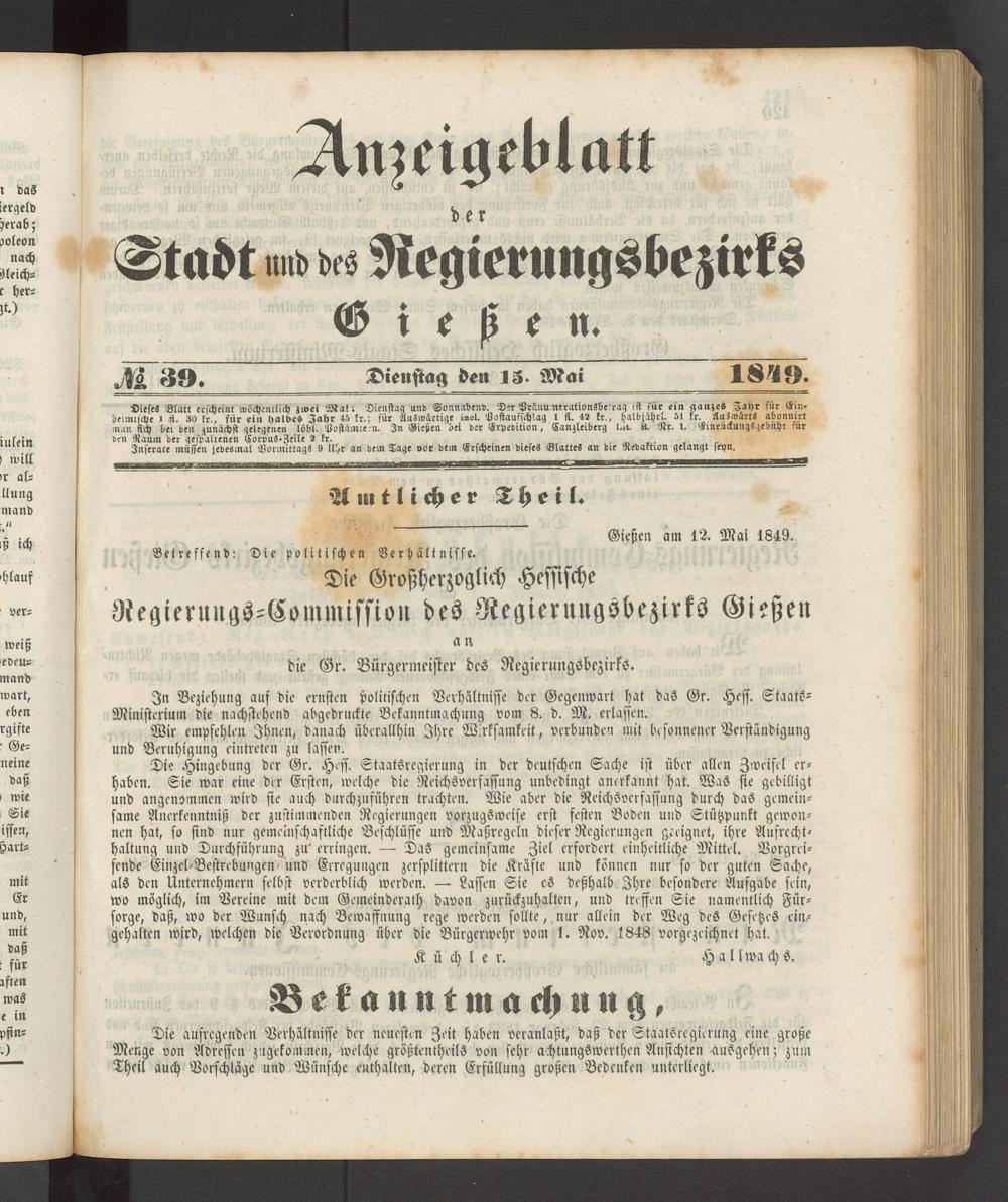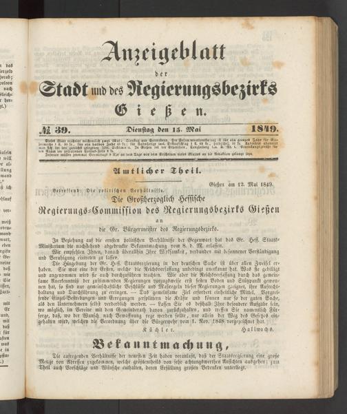 Anzeigeblatt für die Provinzialhauptstadt Gießen. 1840-1867