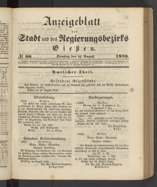 Anzeigeblatt für die Provinzialhauptstadt Gießen. 1840-1867