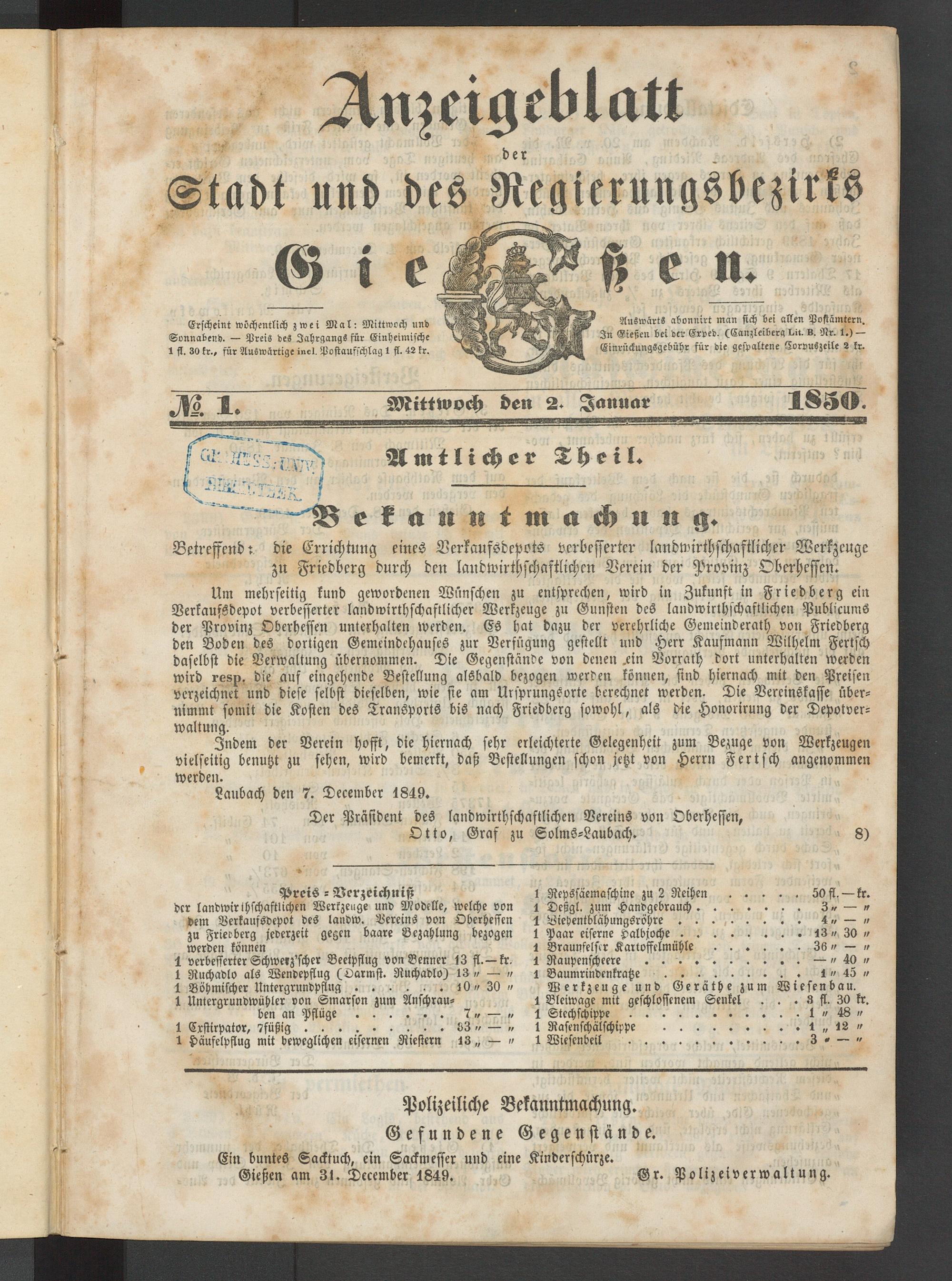 Anzeigeblatt für die Provinzialhauptstadt Gießen. 1840-1867