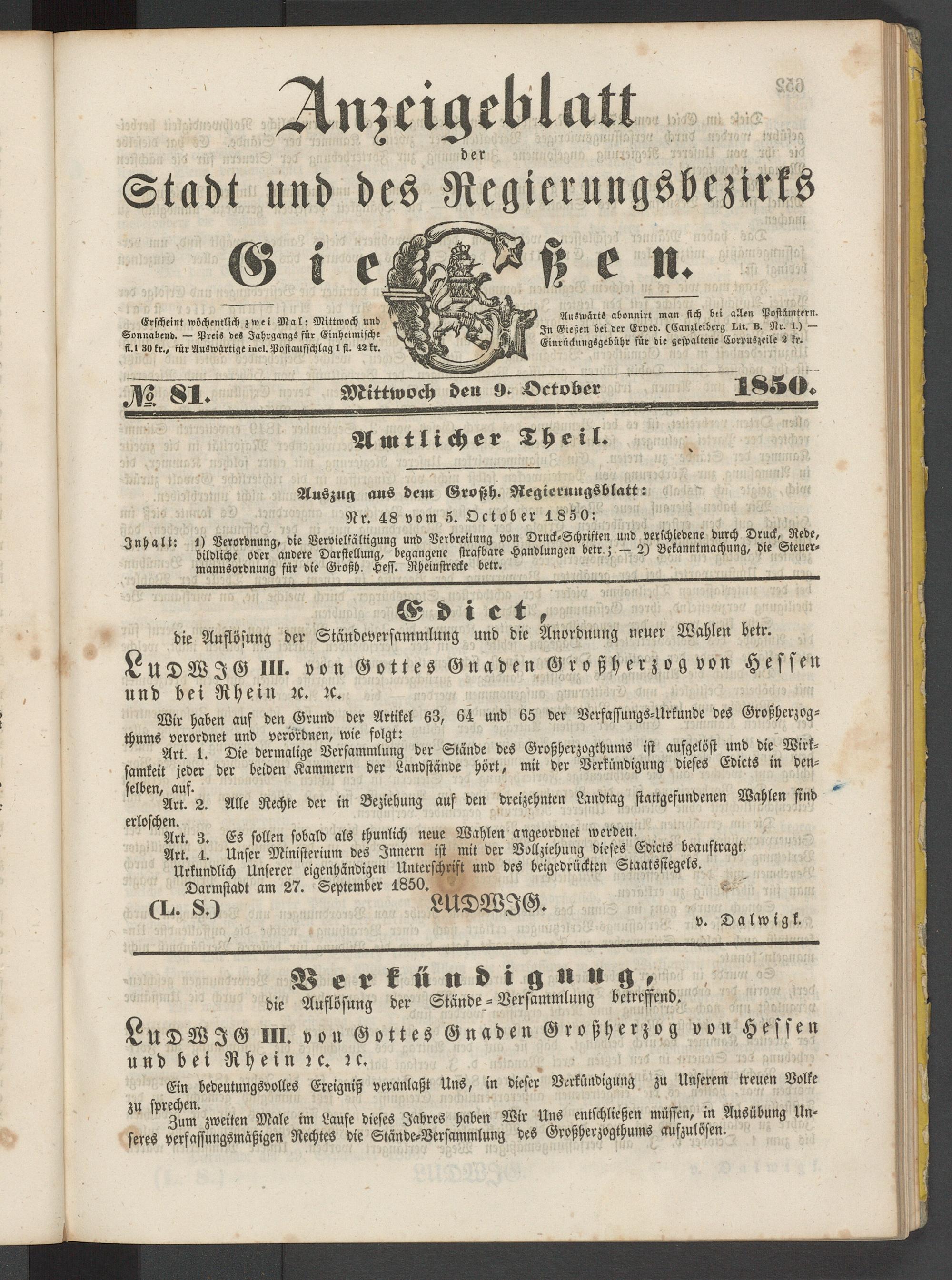 Anzeigeblatt für die Provinzialhauptstadt Gießen. 1840-1867