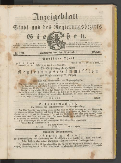 Anzeigeblatt für die Provinzialhauptstadt Gießen. 1840-1867