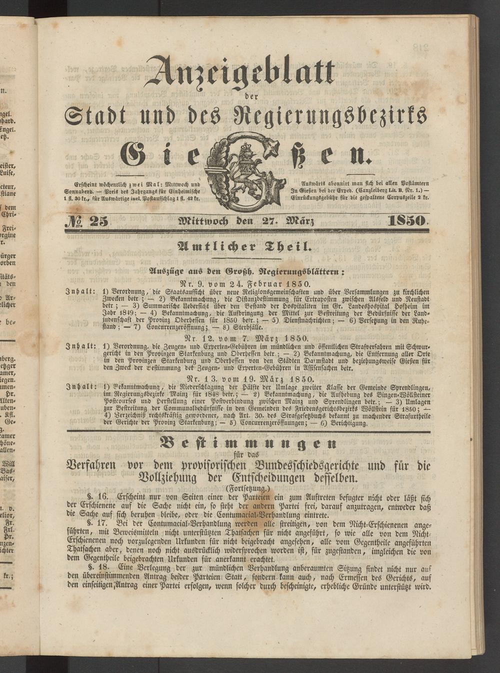 Anzeigeblatt für die Provinzialhauptstadt Gießen. 1840-1867