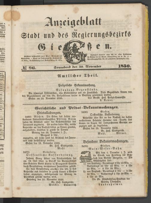 Anzeigeblatt für die Provinzialhauptstadt Gießen. 1840-1867
