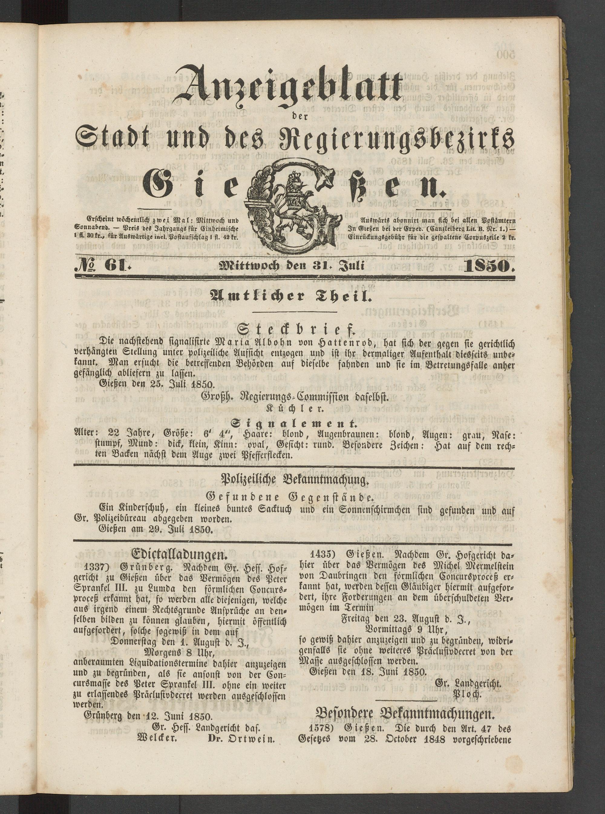 Anzeigeblatt für die Provinzialhauptstadt Gießen. 1840-1867