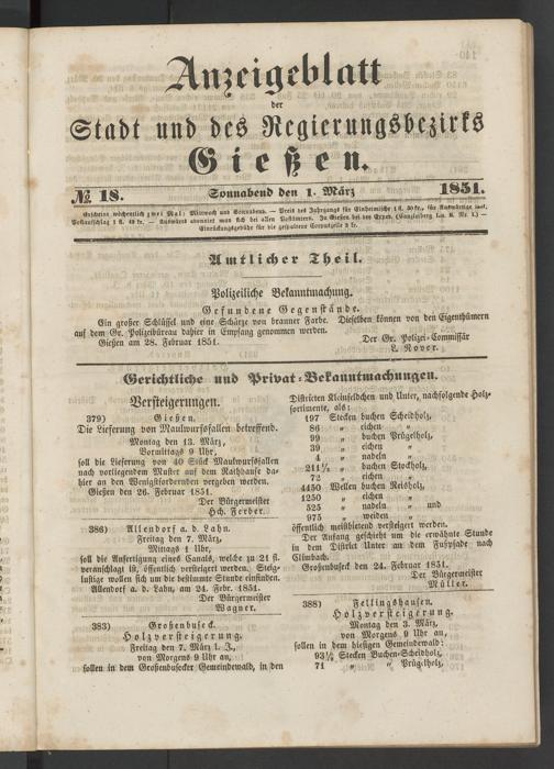 Anzeigeblatt für die Provinzialhauptstadt Gießen. 1840-1867