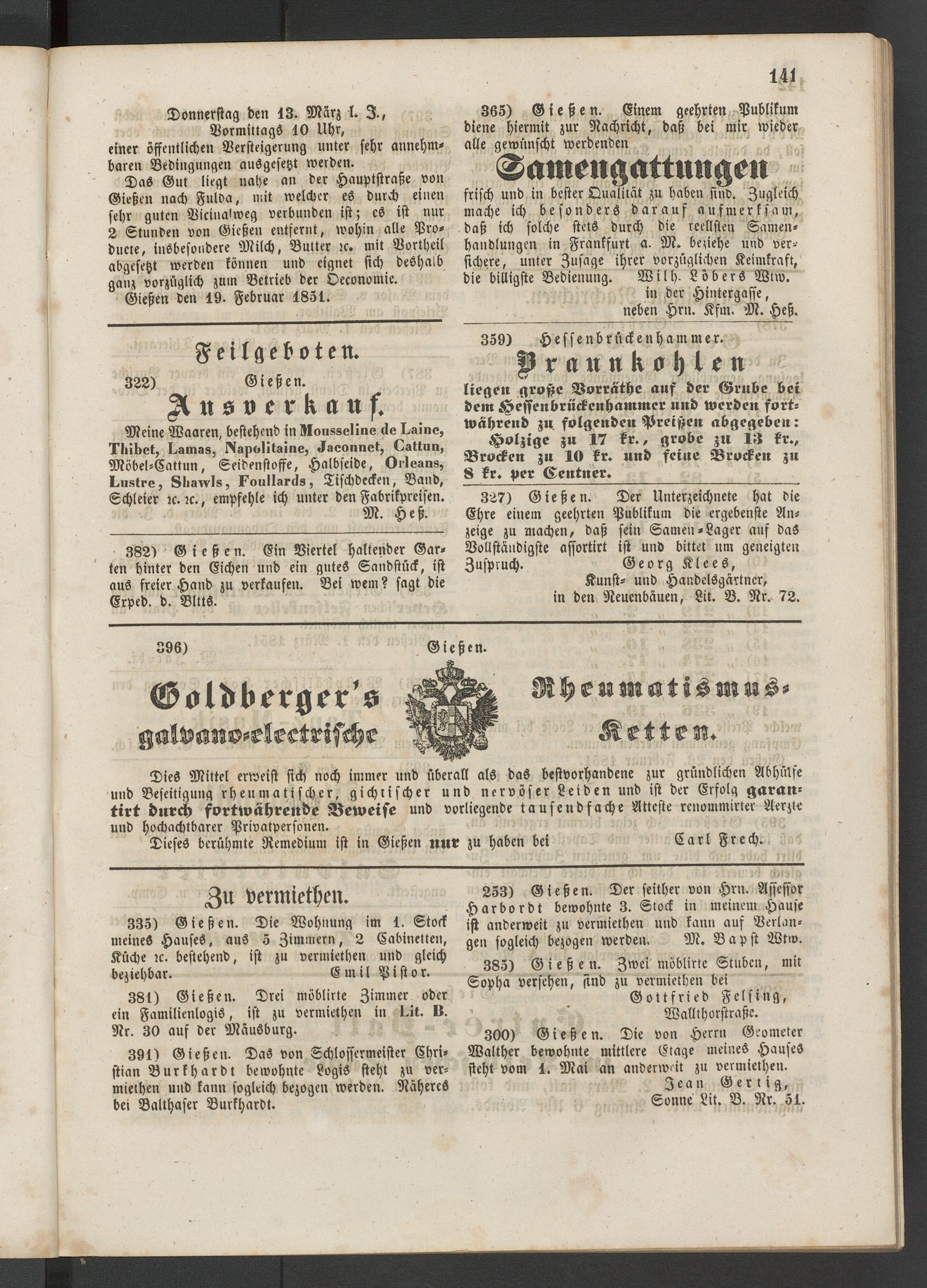 Anzeigeblatt für die Provinzialhauptstadt Gießen. 1840-1867