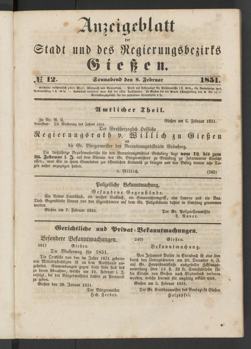 Anzeigeblatt für die Provinzialhauptstadt Gießen. 1840-1867