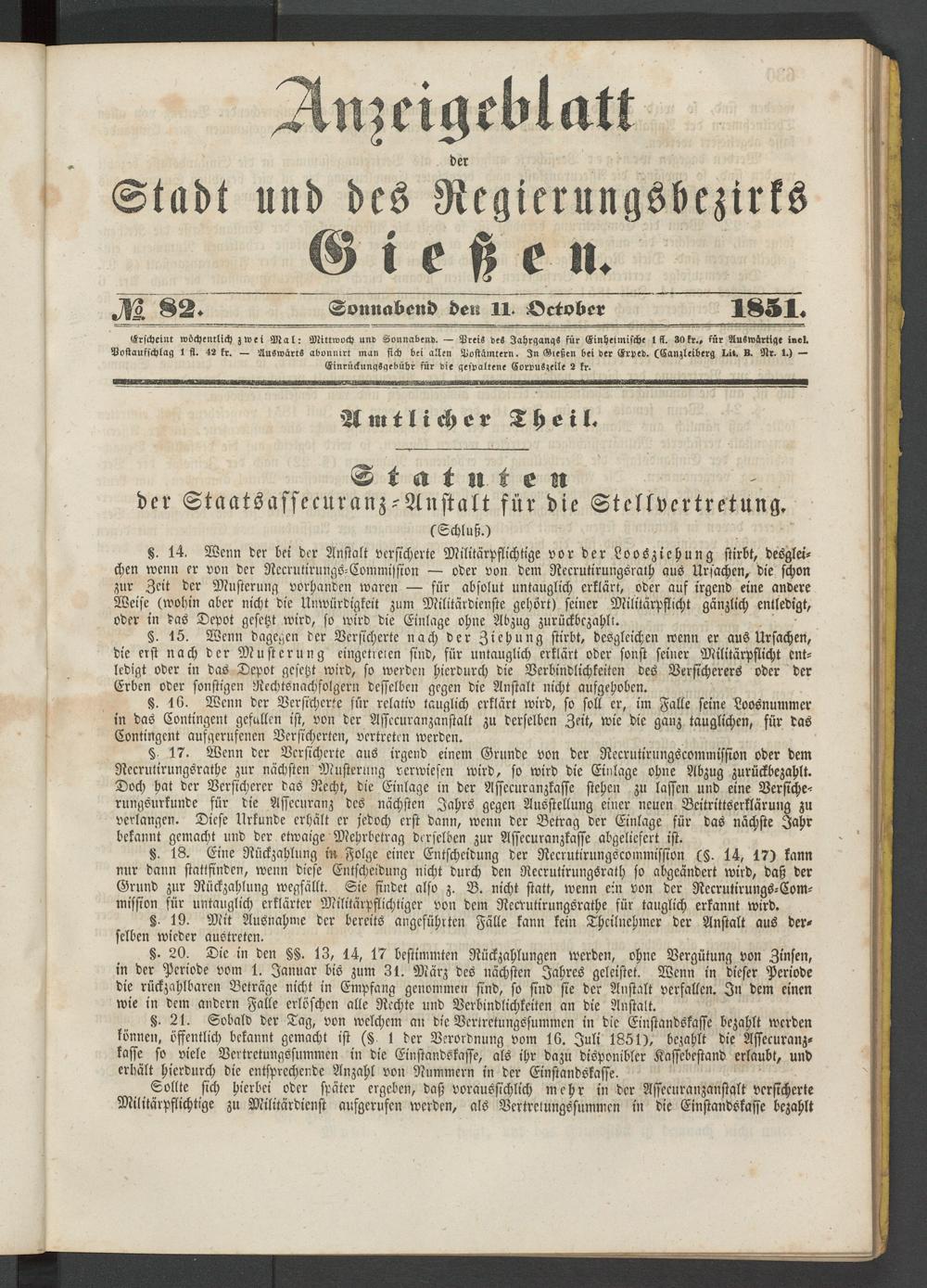 Anzeigeblatt für die Provinzialhauptstadt Gießen. 1840-1867