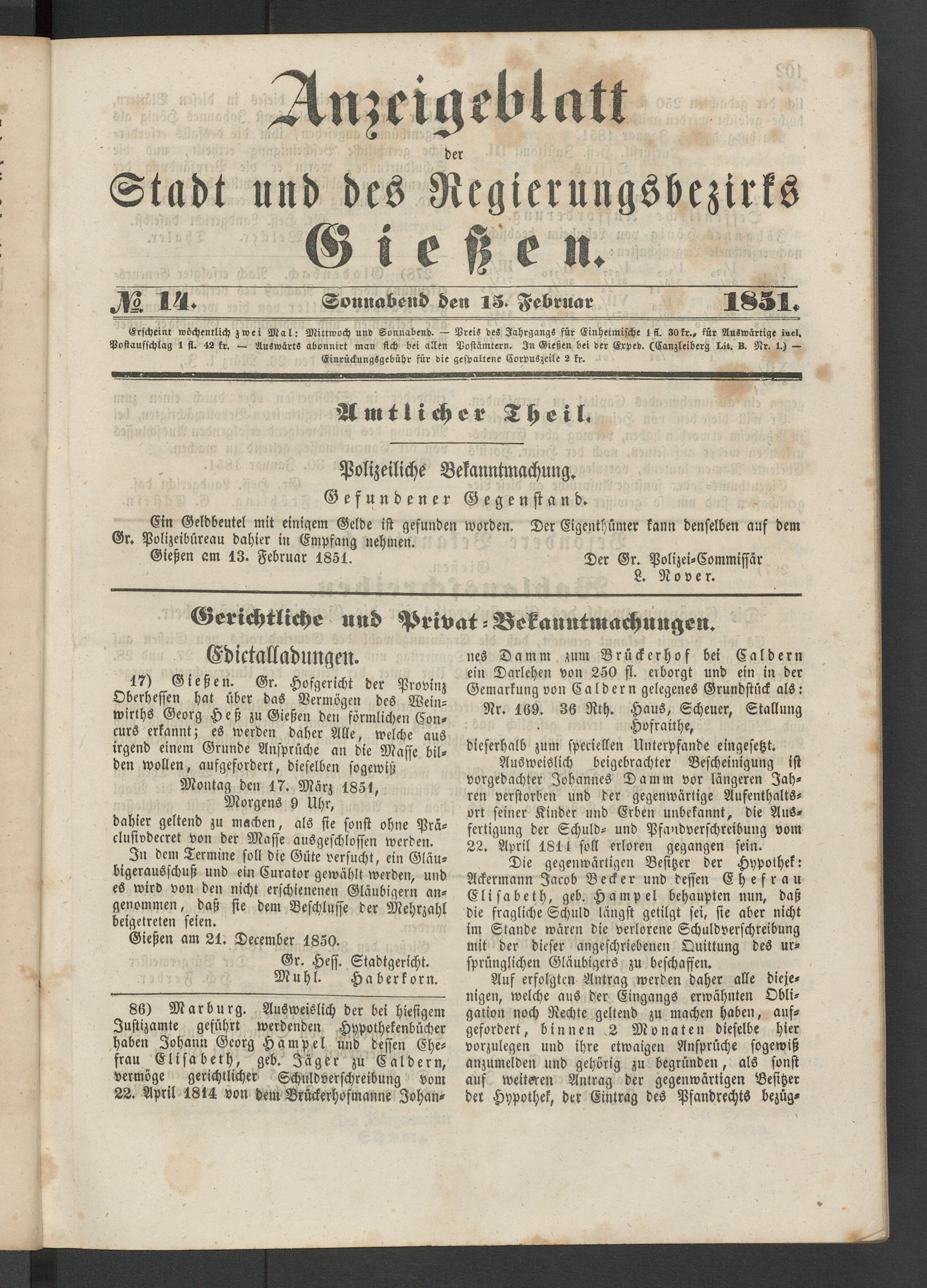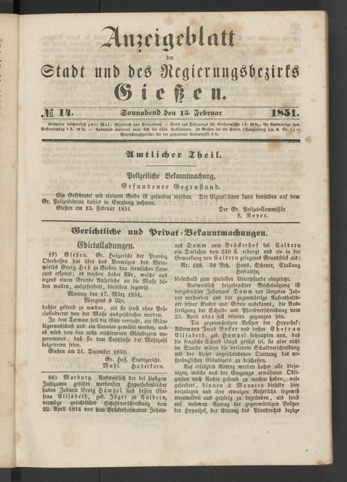 Anzeigeblatt für die Provinzialhauptstadt Gießen. 1840-1867