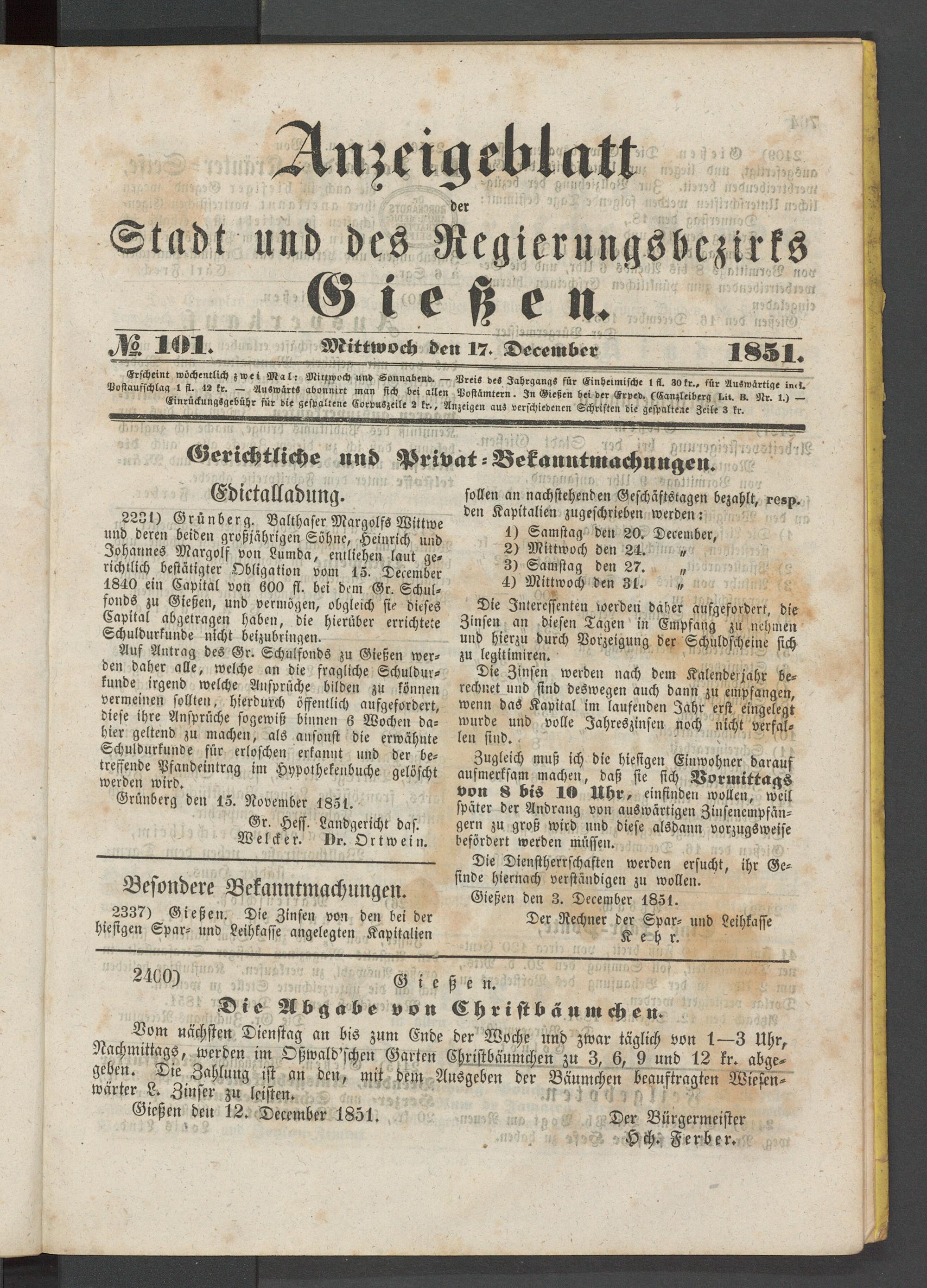 Anzeigeblatt für die Provinzialhauptstadt Gießen. 1840-1867
