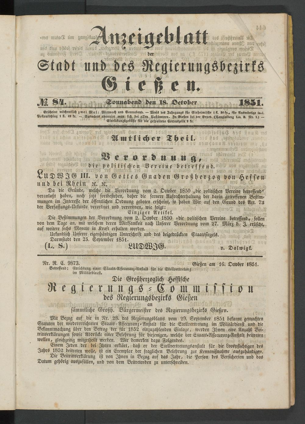 Anzeigeblatt für die Provinzialhauptstadt Gießen. 1840-1867