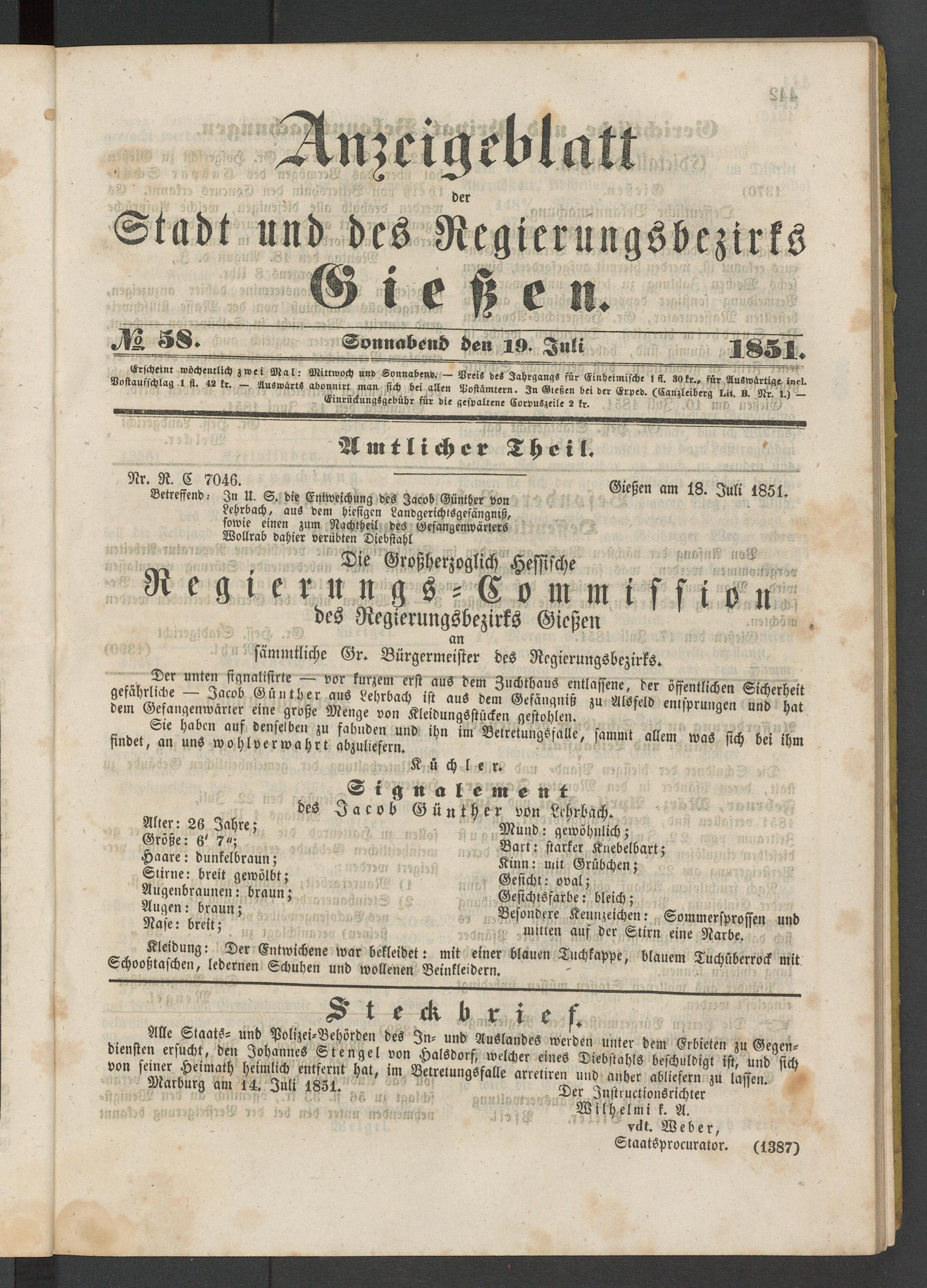 Anzeigeblatt für die Provinzialhauptstadt Gießen. 1840-1867