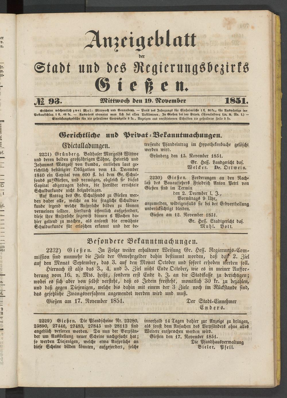 Anzeigeblatt für die Provinzialhauptstadt Gießen. 1840-1867