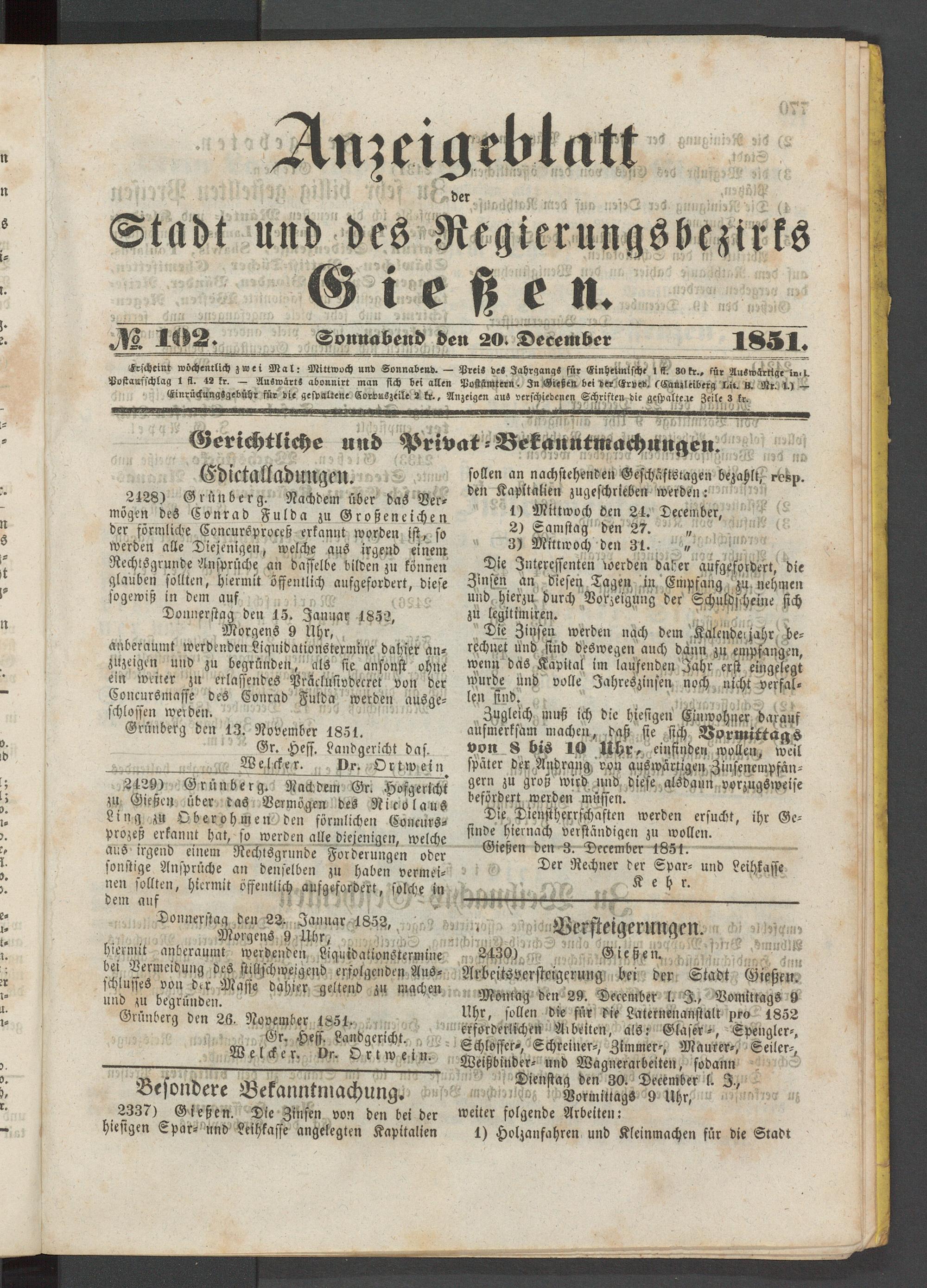 Anzeigeblatt für die Provinzialhauptstadt Gießen. 1840-1867