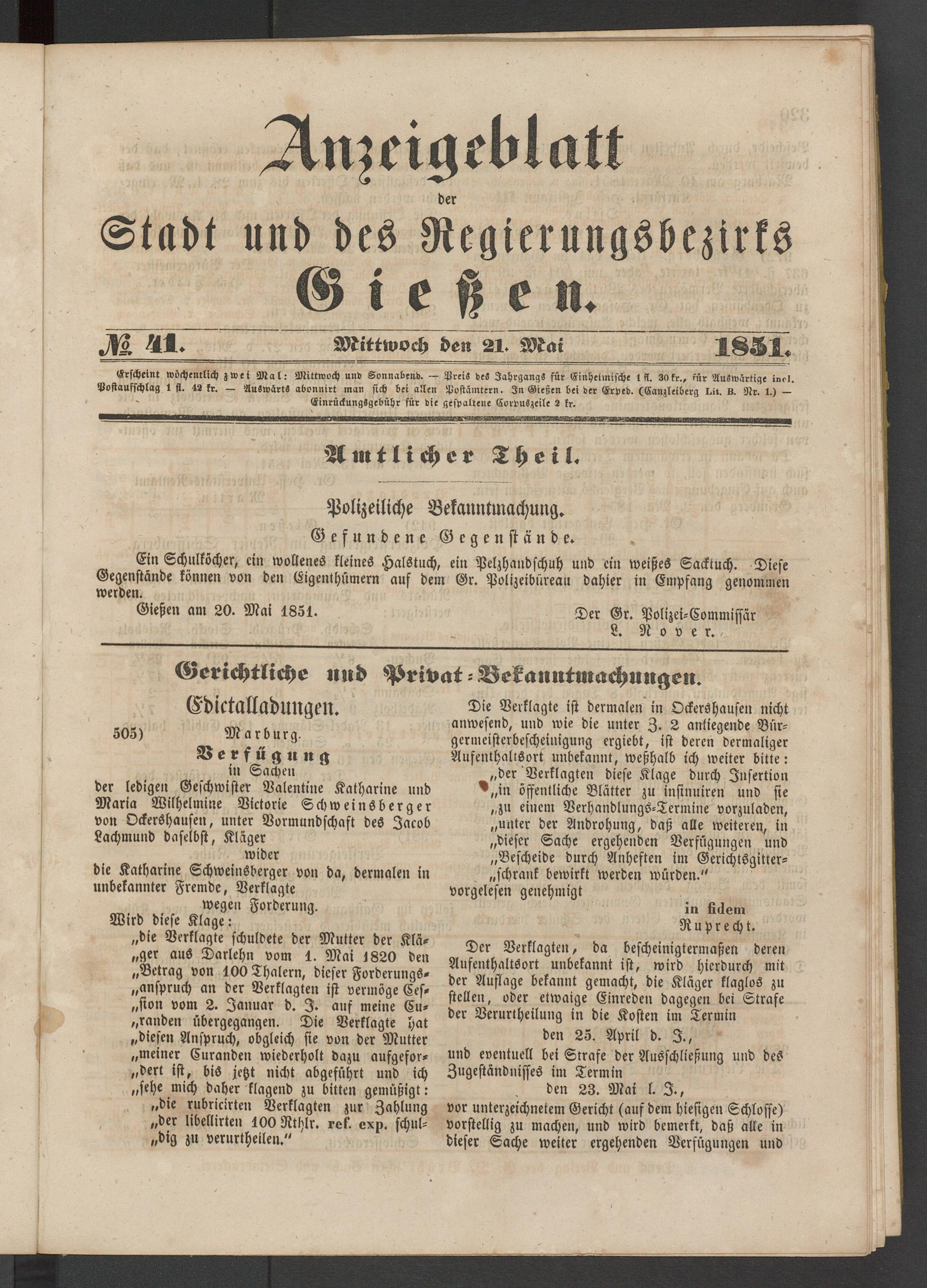 Anzeigeblatt für die Provinzialhauptstadt Gießen. 1840-1867