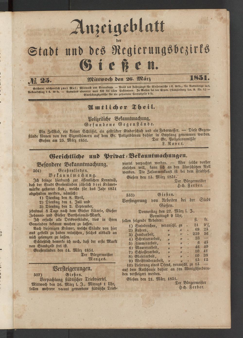Anzeigeblatt für die Provinzialhauptstadt Gießen. 1840-1867