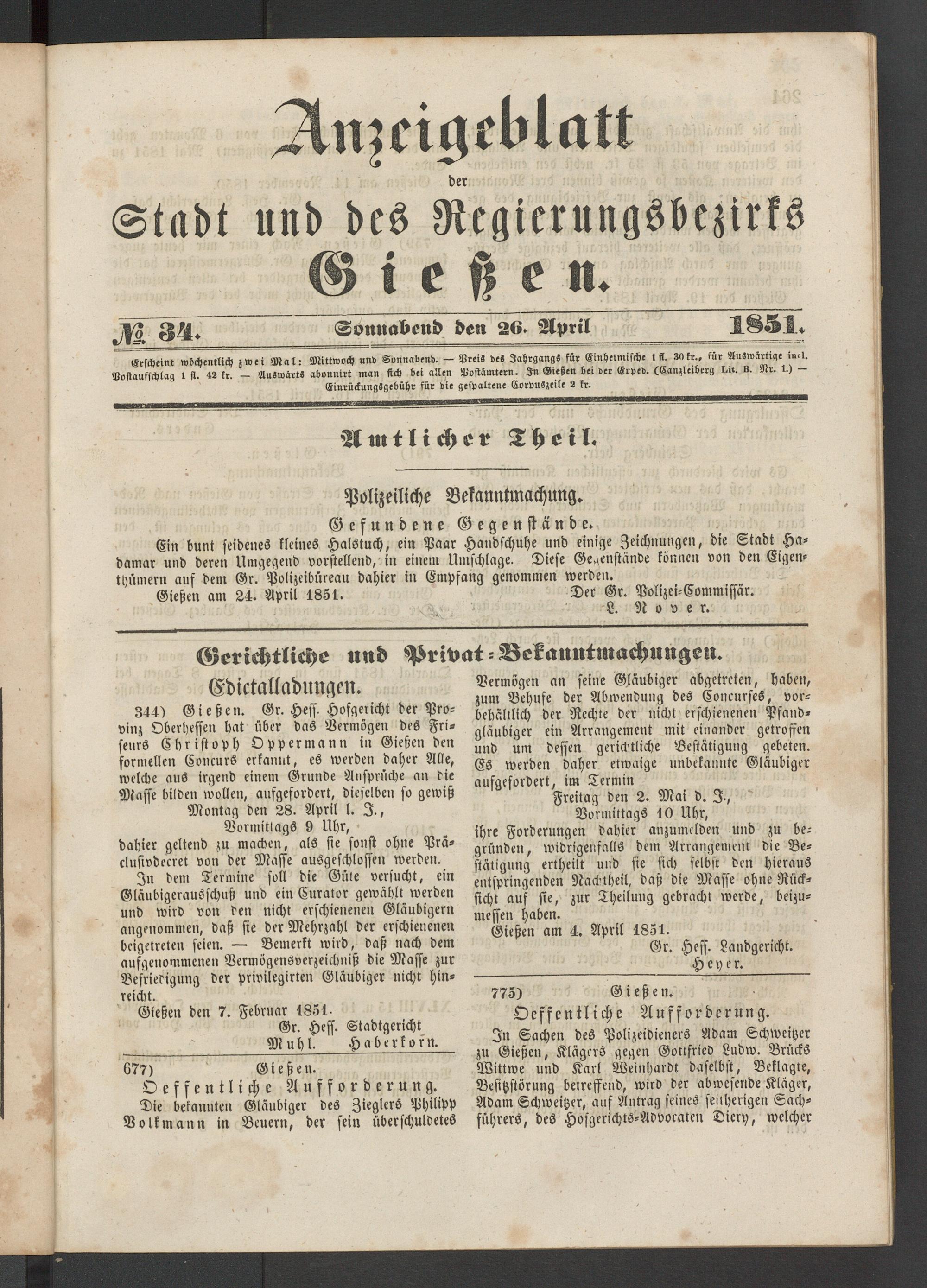 Anzeigeblatt für die Provinzialhauptstadt Gießen. 1840-1867