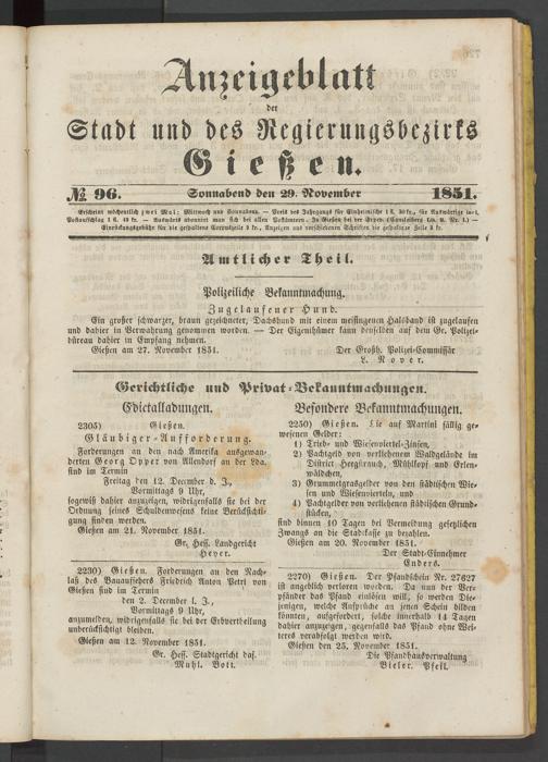 Anzeigeblatt für die Provinzialhauptstadt Gießen. 1840-1867