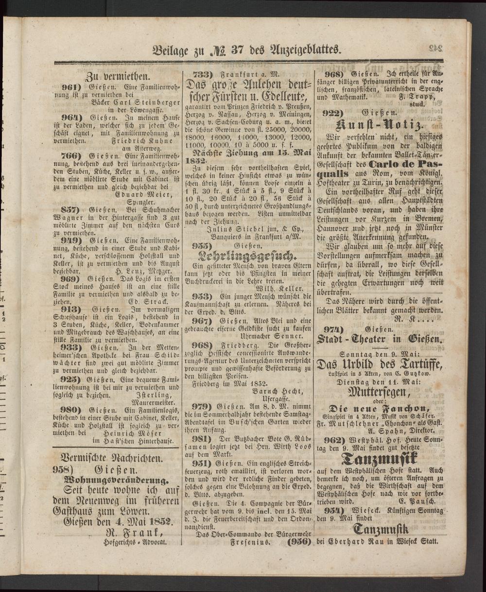 Anzeigeblatt für die Provinzialhauptstadt Gießen. 1840-1867